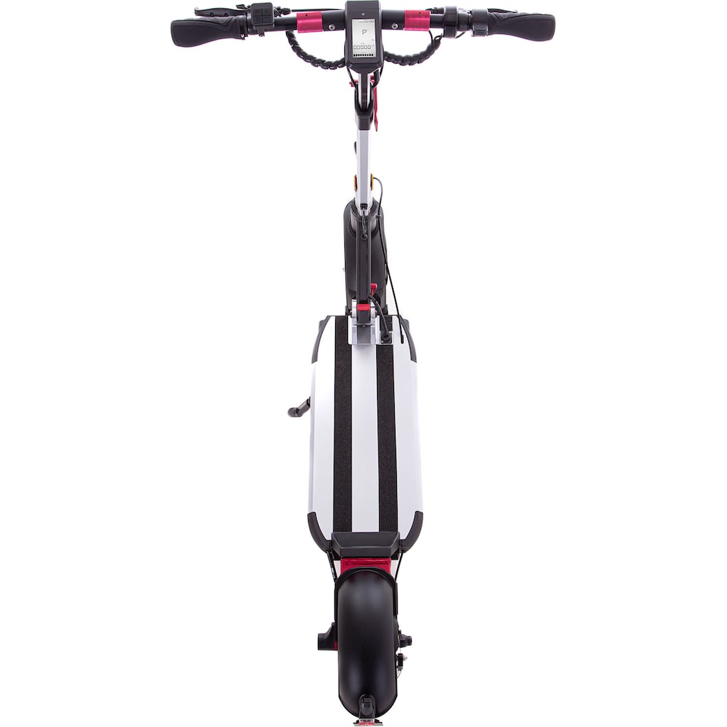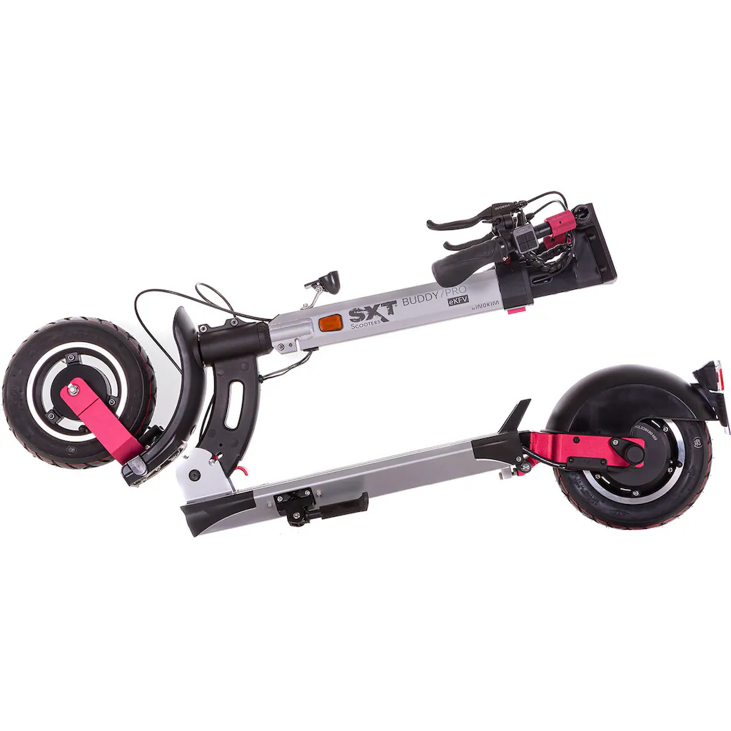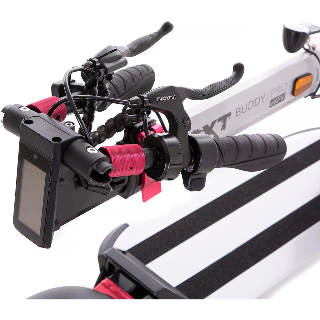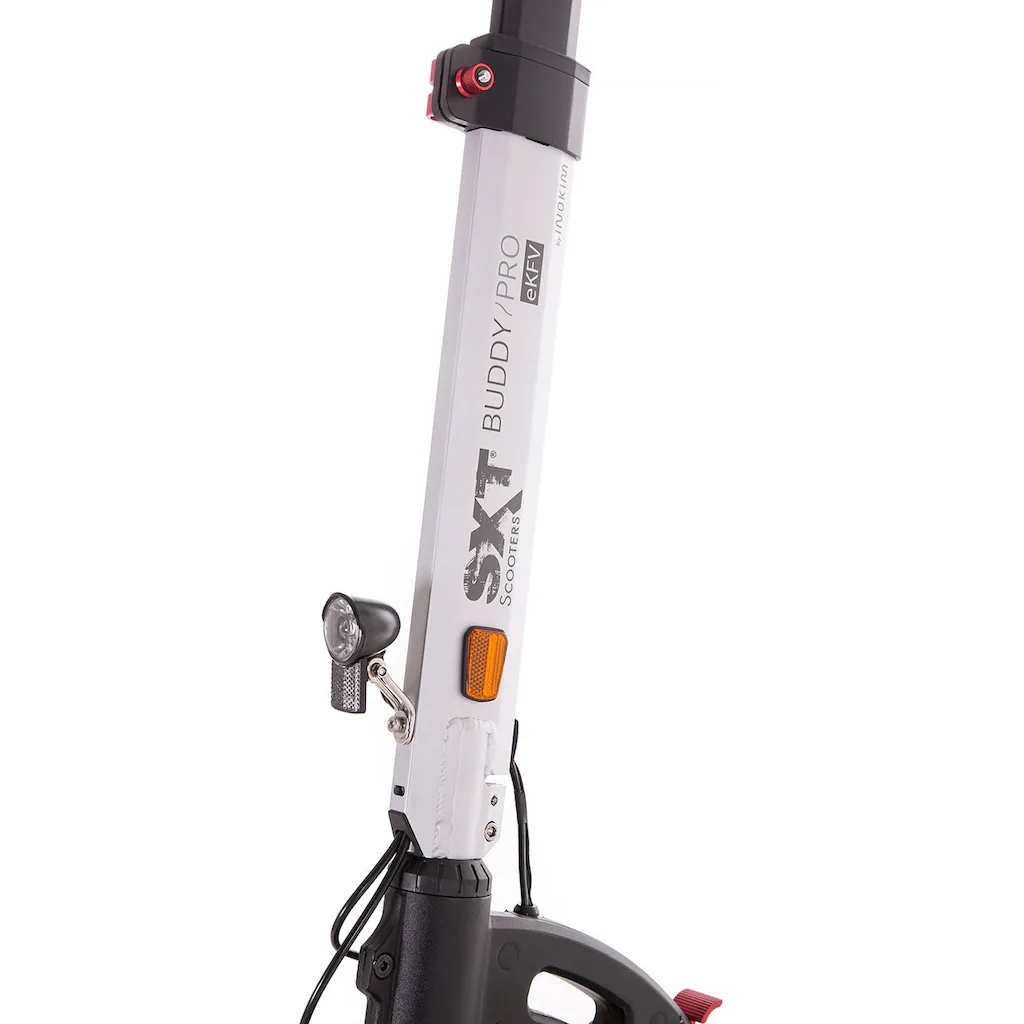 Der speziell für die eKFV straßenzugelassenen Version konzipierte Motor, erreicht bei einer Nennleistung von 500W einen Drehmoment von 25 Nm. Dies reicht aus um auch größere Steigungen locker zu überwinden. Wir haben dem Fahrzeug einige technische Features verpasst – dies ist unter anderem die Aktivierung per NFC Keycard sowie einen Lichtsensor der die Fahrzeugbeleuchtung bei Dämmerung automatisch aktiviert. Um den SXT Buddy PRO trotz seiner Größe im aufgeklappten Zustand, relativ platzsparend transportieren oder verstauen zu können, verfügt er über abklappbare Lenkergriffe sowie eine Klappfunktion samt Arretierung der Lenkerstange. Beim Abstellen des Fahrzeuges kann dies gegen unbefugte Benutzung und Diebstahl mit einem Kabelschloss durch die vorhandene Öse schnell und einfach gesichert werden.